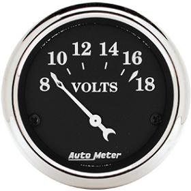 AUTOMETER - OLD TYME BLACK SERIES, WHITE ILLUMINATION AROUND DIAL, INCLUDES RED AND GREEN BULB COVERS FOR CUSTOMIZED LOOK, CHROME BEZEL, VOLTMETER GAUGE, 2 1/16', 8 - 18 VOLTS